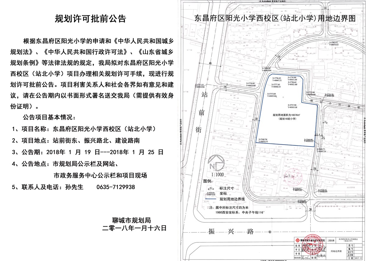东昌府区阳光小学西校区(站北小学)批前公告