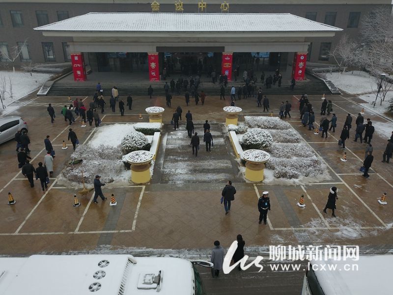 昨天晚上聊城市迎来2018年首场降雪。图为会前代表委员们踏雪而来,步入会场。