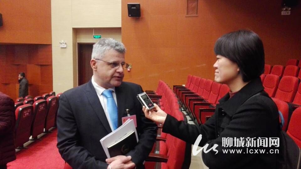 列席会议的聊城市荣誉市民在会后接受采访。